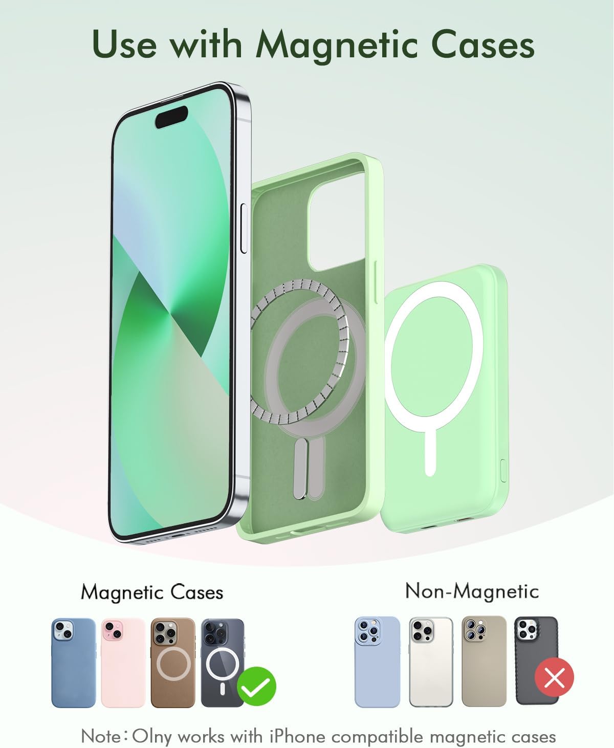 - Charging with Magnetic Phone Case: We recommend charging with phone case or without cases to get enough suction (Using a non-magnetic phone case will cause the phone to not adsorb properly)