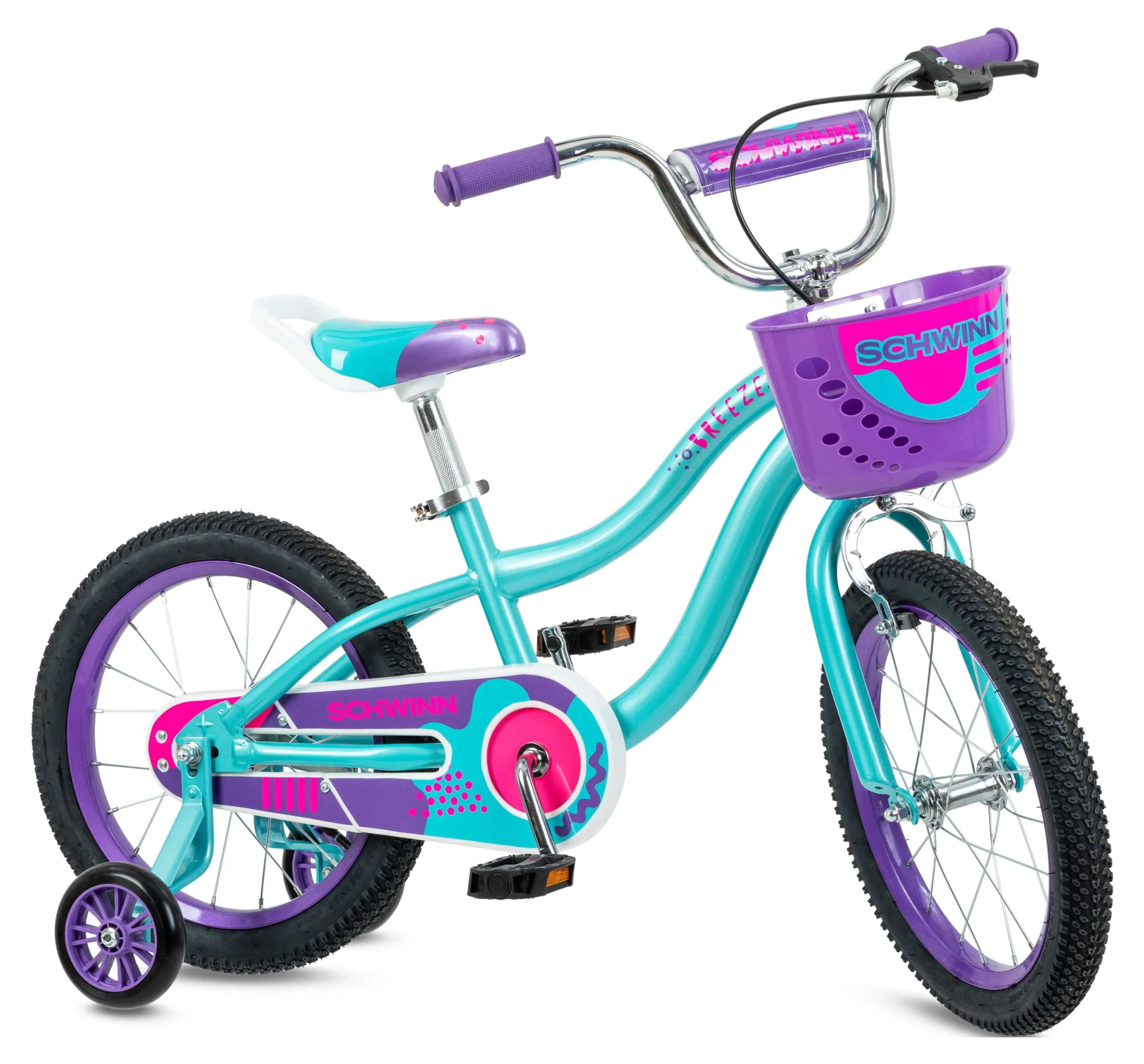 Schwinn Breeze 16 Inch Girls Kids Bike with Basket and Training Wheels, Ages 3-7, Teal and Purple