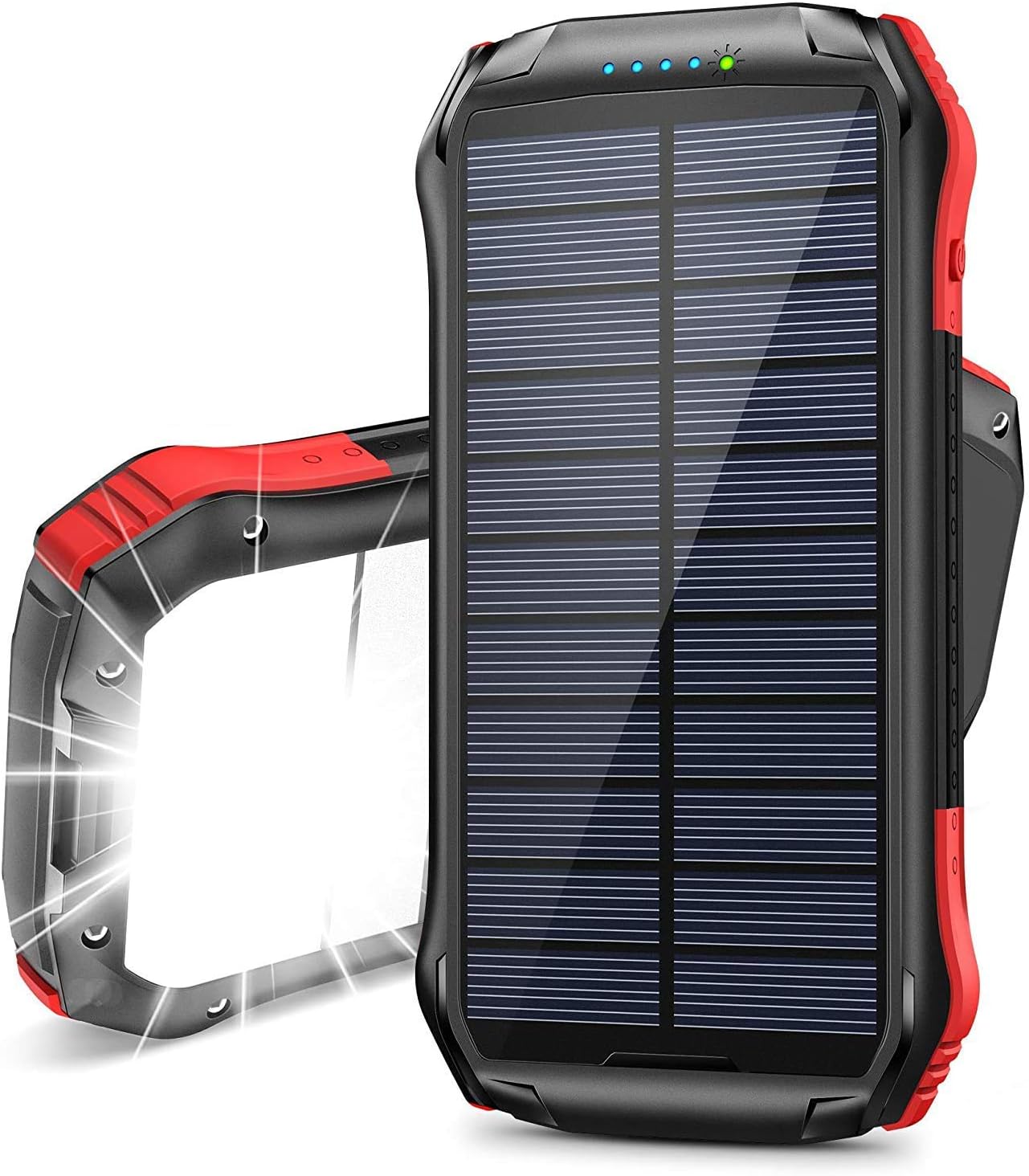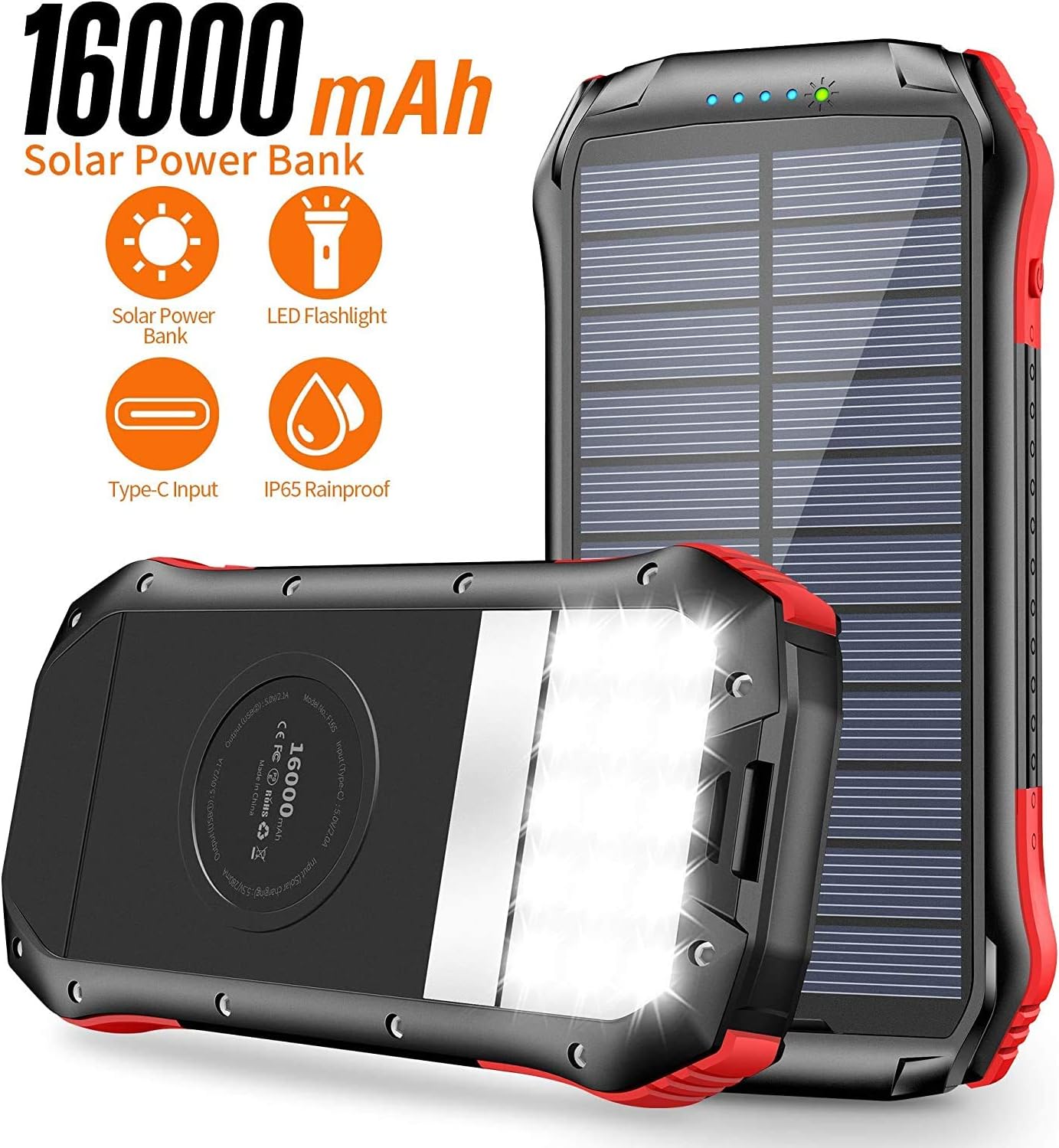 - 1. 16000mAh capacity solar mobile power bank, which can be used to charge mobile phones more than 3 times, 4 LED power indicator lights to remind the remaining power. When the solar is charging, the ll green sun next to the battery indicator lights up.